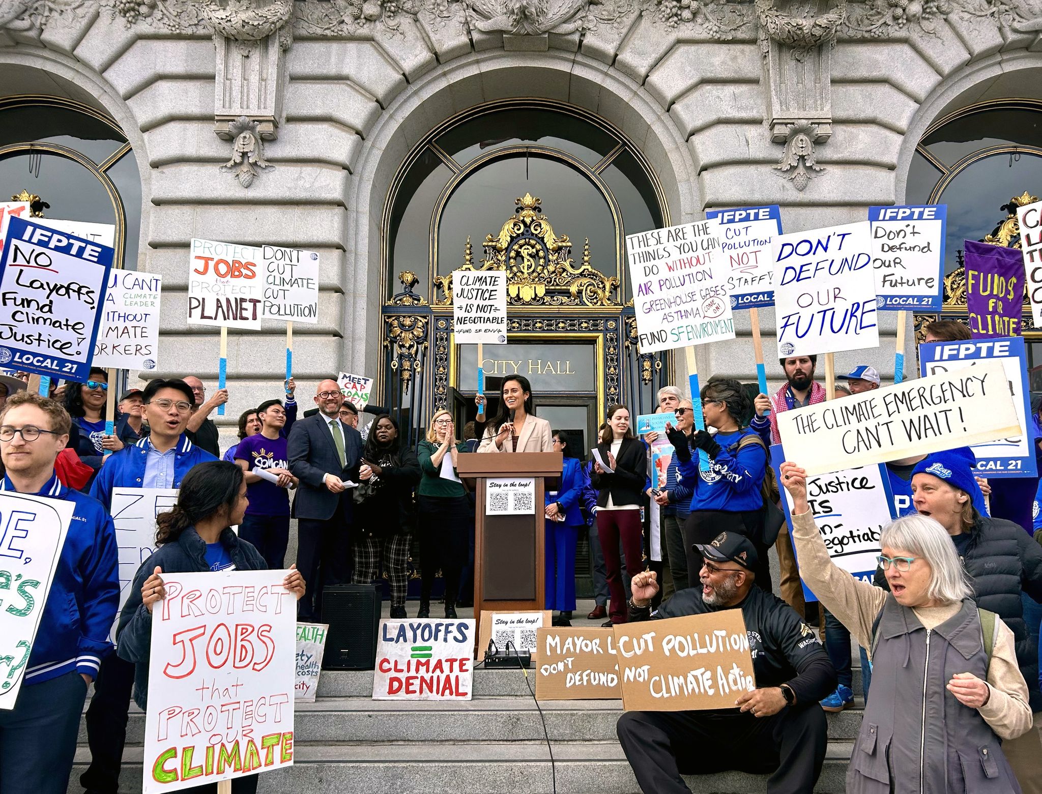 Hundreds of climate activists filled the steps of San Francisco City Hall on Wednesday to rally against possible funding cuts to the city’s Environment Department.